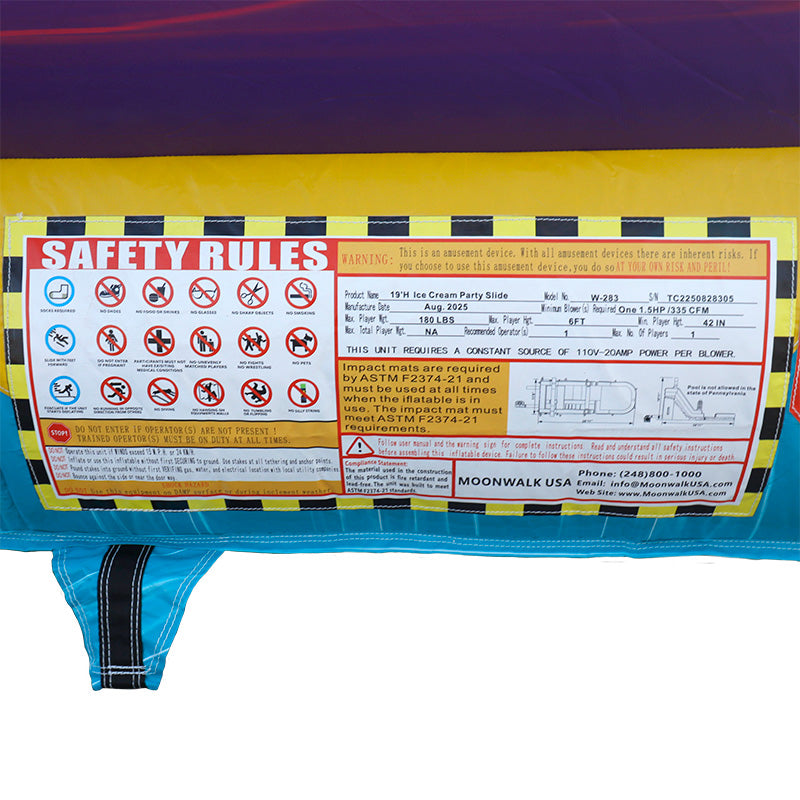 Safety: All Moonwalk USA inflatable games are manufactured to be safe and durable. Our inflatable are FIRE RETARDANT and LEAD FREE. Safety step is standard for all our bouncers and combos. Anti-Jumping safety netting on all our slides to prevent player’s unsafe behavior. Anchors and safety straps included in all inflatable games. Warning sign and other safety signs sewn at the entrance. All inflatables meet or exceed the standards of ASTM and CPSIA compliance.