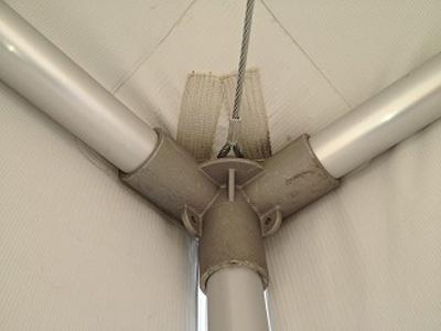 Material: Tent top is made of Commercial grade, 16 oz, Fire Retardant, UV Resistant, Block-Out vinyl material, Frames & Poles are 2.5" anodized aluminum tube, Corner Fitting and Foot Plate are cast aluminum.